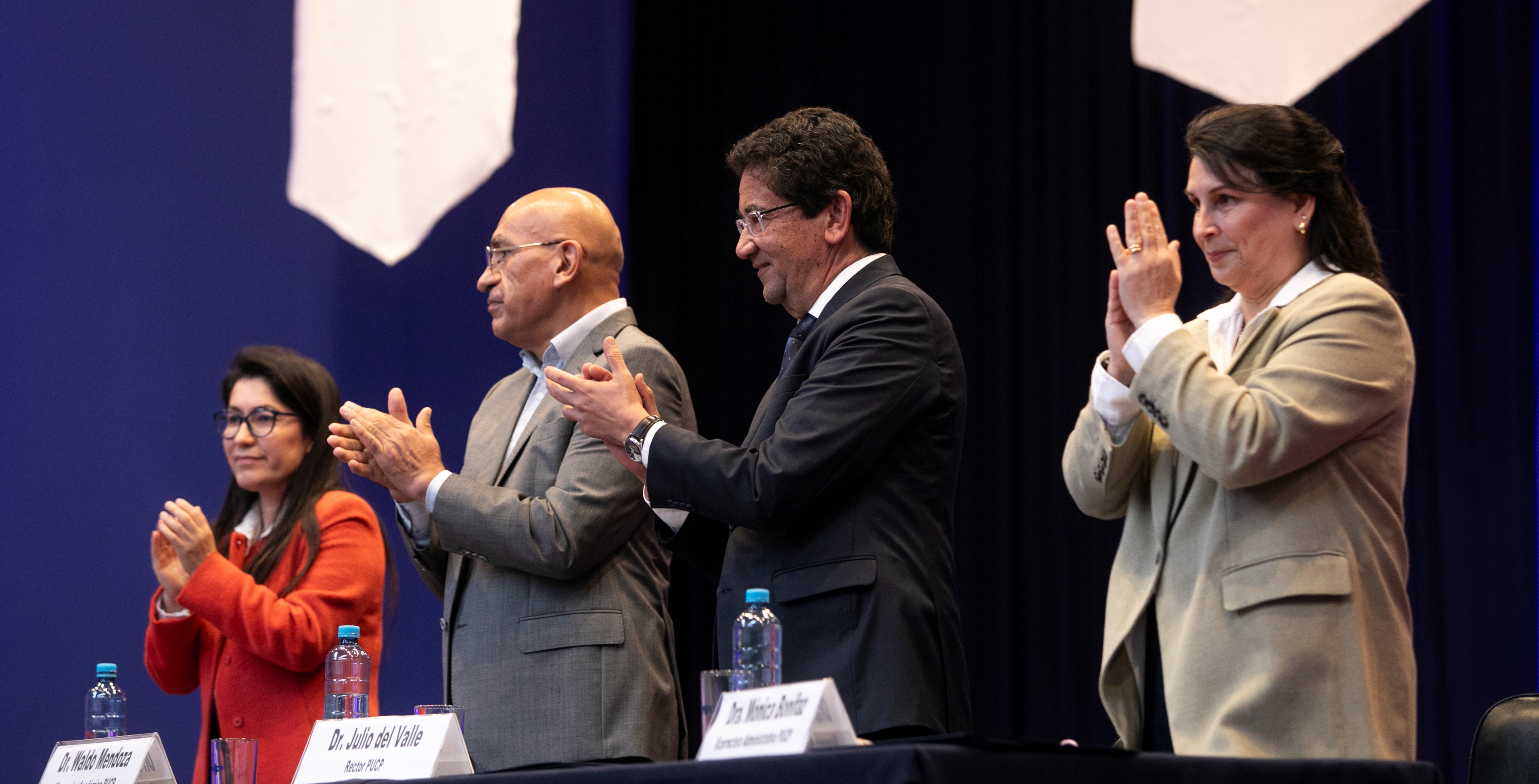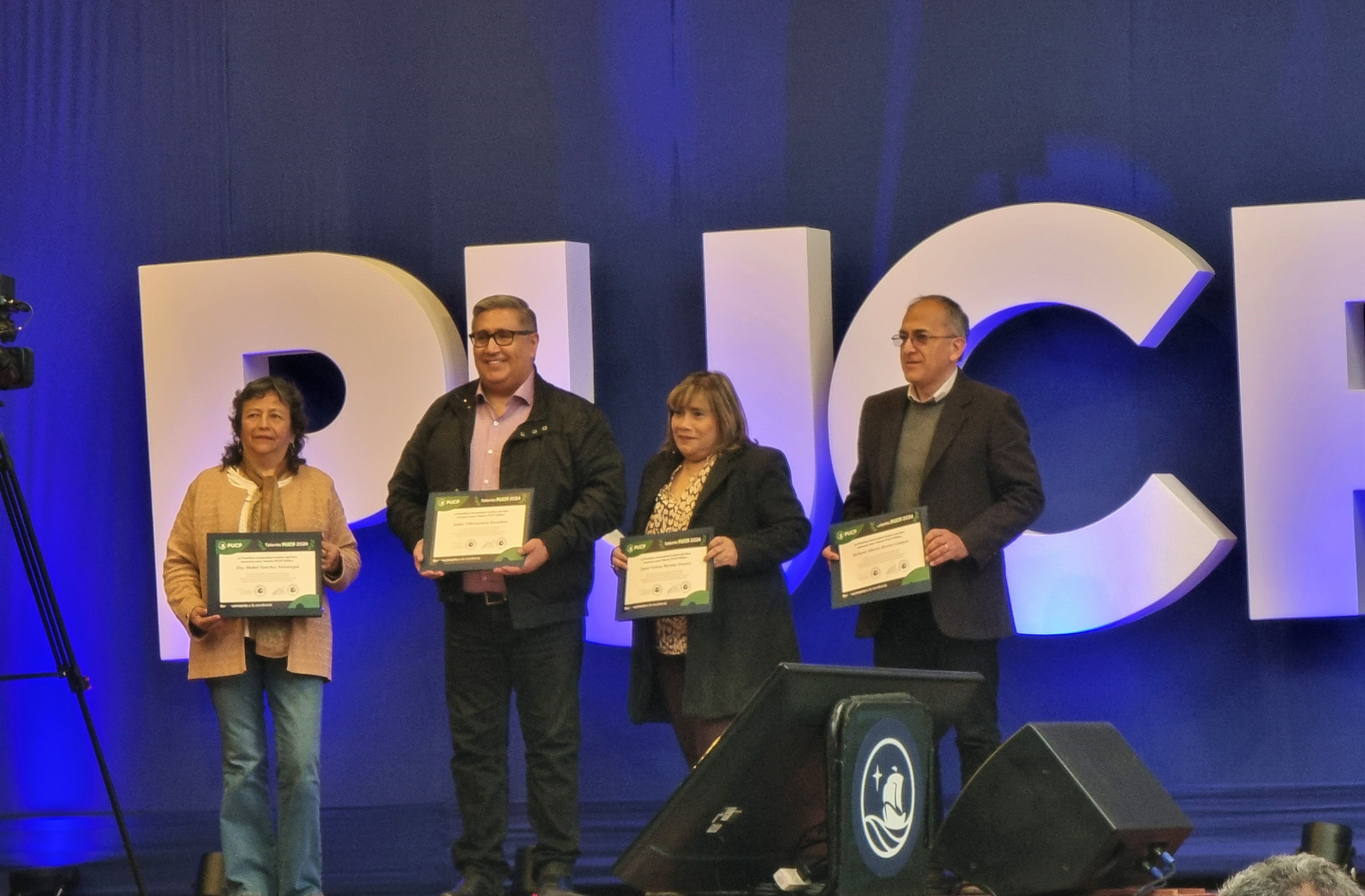 En esta ocasión, en la mesa de honor estuvieron presentes el Dr. Julio del Valle, rector PUCP; la Dra. Mónica Bonifaz, vicerrectora administrativa; el Dr. Waldo Mendoza, vicerrector académico; y la Mag. Pamela Palma por la Dirección de Gestión del Talento Humano (DGTH), quienes brindaron su reconocimiento como Mejor Talento PUCP 2024 del Departamento Académico de Ciencias a la Lic. Doris Moreno Álvarez, asistente administrativa de la Jefatura del Departamento; y al Ing. Richard Rivera Campos, Jefe del laboratorio de acústica de la sección Física.